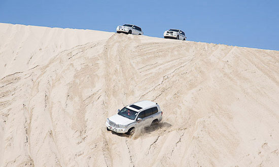 your adventure starts by heading 75 km south of Doha taking the sights of the city, its suburbs and countryside along the way. Following a brief stop at Sealine Beach in Meisaeed (where our professional drivers will first deflate the tyres to make sure the vehicle is ready for the dune bashing), we abandon the boring tarmac for the exhilarating, breath-taking, roller-coaster drives across the desert sand dunes . The crossing of the desert is a real adventure in itself and an event to remember. You can decide on the kind of ride you want – fast and bumpy or a smooth and casual one. The drive will also take you to the spectacular inland sea of Khor al-Udaid (near the Qatar-Saudi Arabian border) with its white sandy beaches pristine, crystal clear water. A swim in the warm inland sea will nicely top off your adventure; just be sure to bring along your swimsuits. Stops during the journey for picture taking sessions will help you keep the memories of your desert adventure alive.
